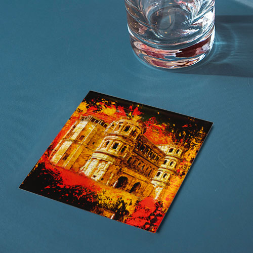 Glas-Untersetzer, Größe 100x100 mm, Handspülung empfohlen, Rückseitig bedruckt